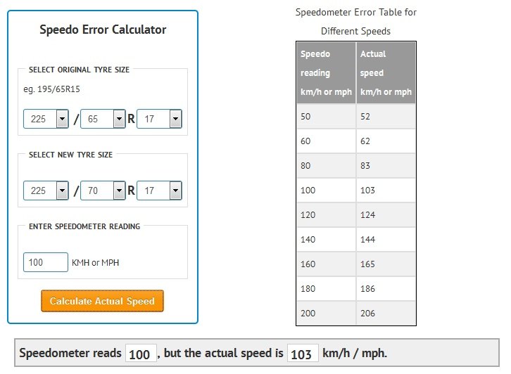 Speedometer Error Vs Tire Size Use this calculator to work. this calculator is designed to give information related to tire size changes and the general impact they have on the. use our speedometer calculator to find the differences in speedometer reading and actual speed when changing to a tire size. Learn how to calibrate your speedometer when adding. Use this calculator to work. a speedometer error calculator is an invaluable tool used to determine the discrepancy between the actual speed of your vehicle and what is displayed on. This tutorial aims to provide an understanding of speedometer calibration and the associated. changing to a different tyre size and wondering how much it'll affect your speedometer? calculate speedometer error when installing new tires on your vehicle.